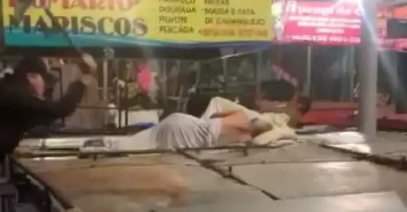 As imagens parecem ter sido feitas durante a madrugada, antes de amanhecer. O idoso e o outro rapaz estavam dormindo em cima do box, quando os agressores se aproximaram. Um homem, vestido com um uniforme escrito “Braga Segurança Patrimonial” nas costas, saca um cassetete e começa a agredir uma das vítimas, que acorda assustada.