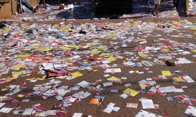 Além disso, dados do Tribunal Superior Eleitoral (TSE) mostram que foram derrubadas cerca de 600 mil árvores para produção de propaganda eleitoral em 2012. Sabe-se que para cada tonelada de papel produzido, são consumidos aproximadamente 20 árvores e 100 mil litros de água.