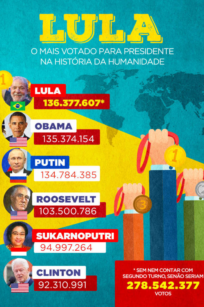 O Instituto Lula somou a votação obtida em cinco eleições disputadas pelo ex-presidente Luiz Inácio Lula da Silva para afirmar que o petista é mais votado da história da humanidade.