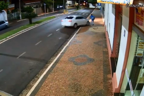 O veículo passa por cima de uma sinalização e faz uma curva fechada.