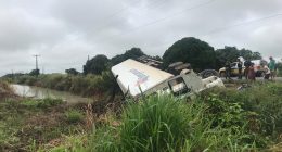 Caminhão carregado de charque tomba na PA-150, próximo a Tailândia