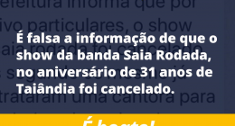 É falsa a informação que circula em grupos de rede sociais de Tailândia, sobre o cancelamento do show da banda Saia Rodada.