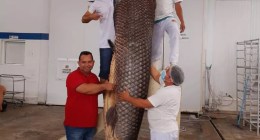 Pirarucu gigante com 2,9 metros e pesando 220 quilos é capturado por ribeirinhos em rio no Amazonas