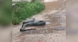 Na imagens o morador flagra a cobra rastejando em direção a uma poça de água que se formou na rua devido o temporal.
