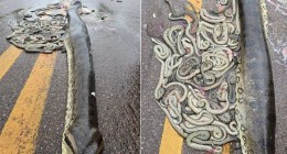 Serpente de aproximadamente 5 metros foi atingida na rodovia MT-338, em Porto dos Gaúchos, Mato Grosso.