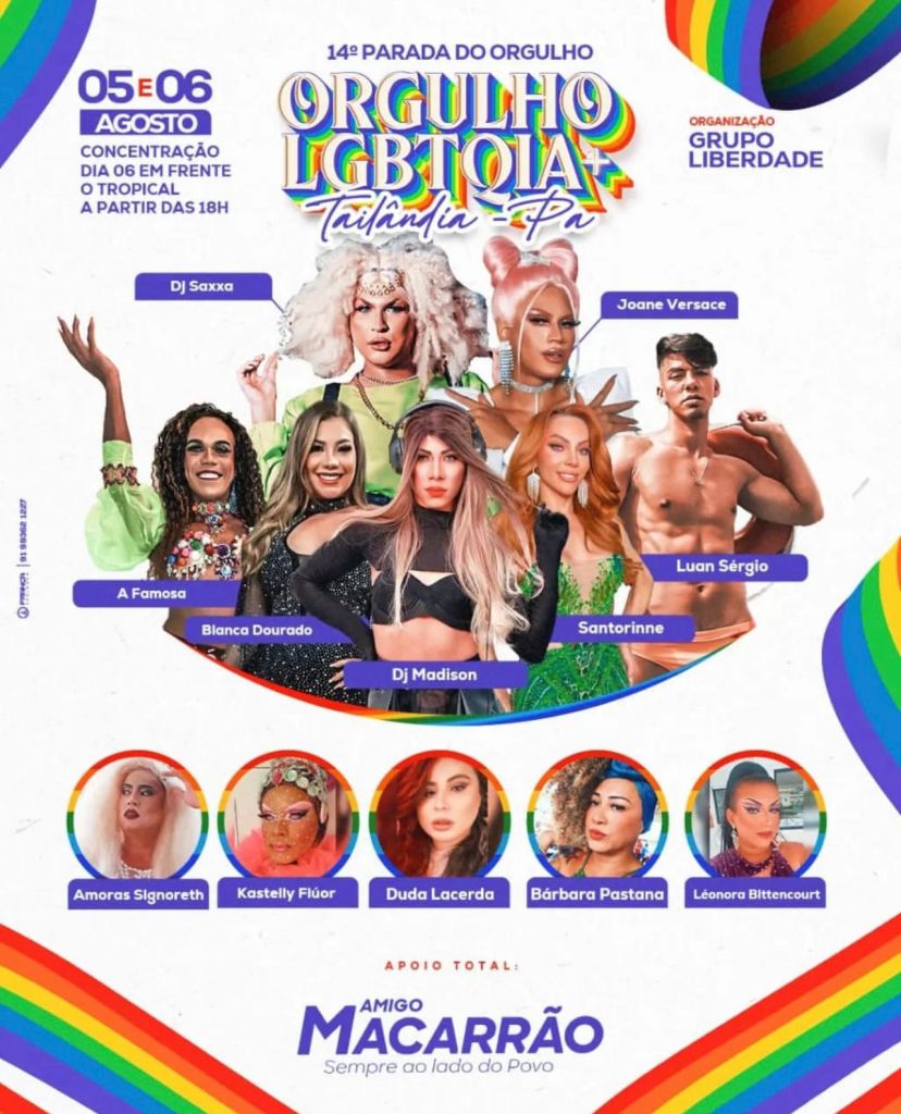 Nos próximos dia 05 e 06 de agosto, acontecerá a 14º edição da Parada do Orgulho LGBTQIA+ em Tailândia, nordeste do Pará. O evento organizado pelo Grupo Liberdade, celebra a diversidade e luta pelos direitos de todas as orientações sexuais e identidades de gênero.