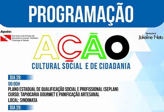 Uma Ação Cultural Social e de Cidadania que será promovida através da vereadora Jakeline Neto, PRP, com apoio da Secretaria de Estado de Assistência Social, Trabalho, Emprego e Renda nos dias 28 à 30 de junho, terá programação com vários atendimentos.