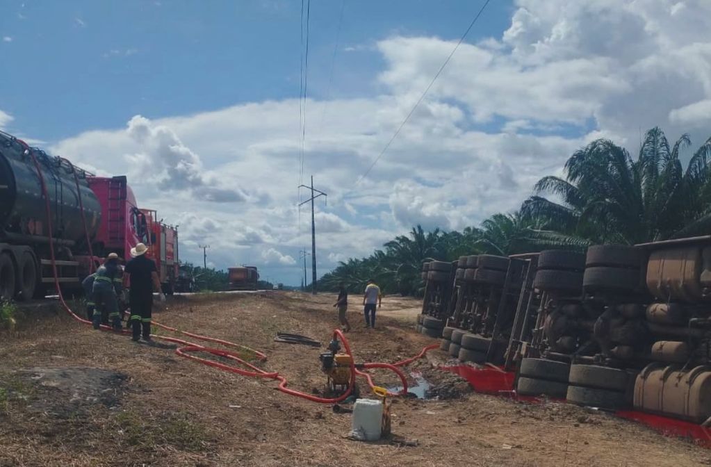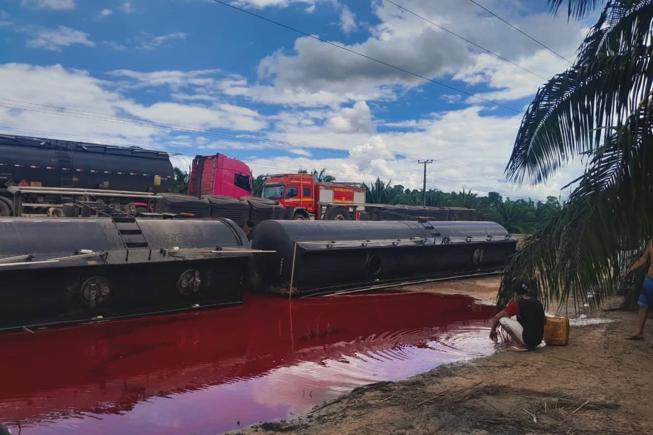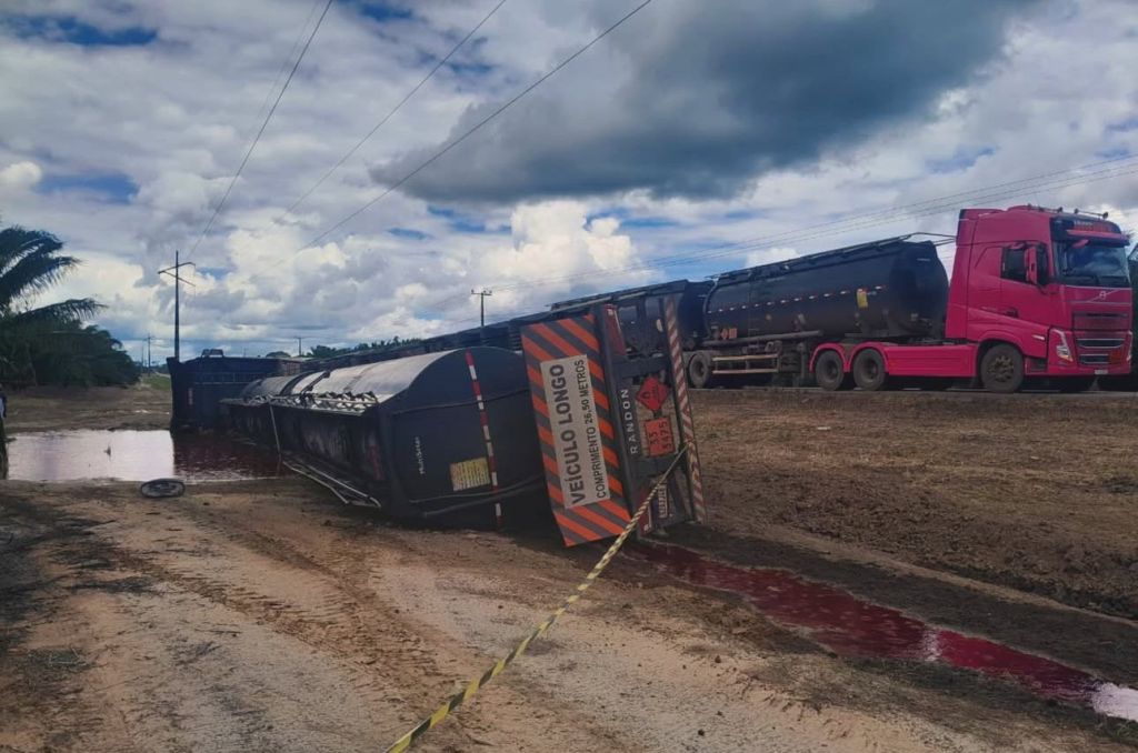 Uma carreta carregada tombou na segunda-feira (19), próximo à vila Turi Açu, no município de Tailândia, nordeste do Pará. O acidente mobilizou o 14º Grupamento de Bombeiros Militares (GBM), que foi acionado para conter e controlar o vazamento de uma substância altamente perigosa.