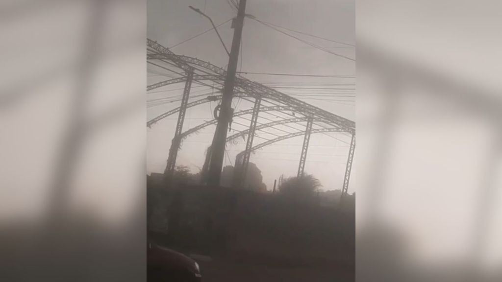 Um vídeo, registrado pelo celular de um popular, mostra a estrutura desabando. Até o momento, não há registros de feridos.
