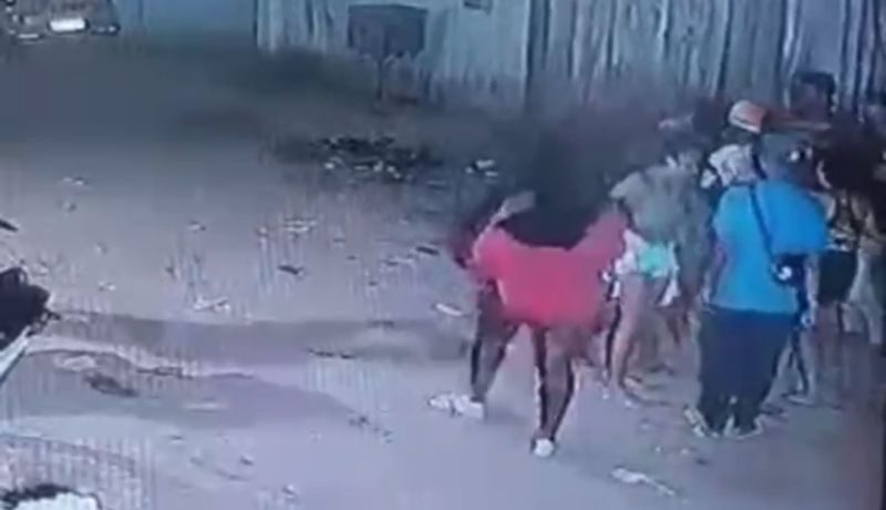 Nas imagens obtidas pela Polícia Civil, é possível ver dois homens que estavam juntos de outras pessoas, correndo. De acordo com a polícia, esse foi o momento em que a suposta vítima é atingida com uma faca no lado esquerdo do peito