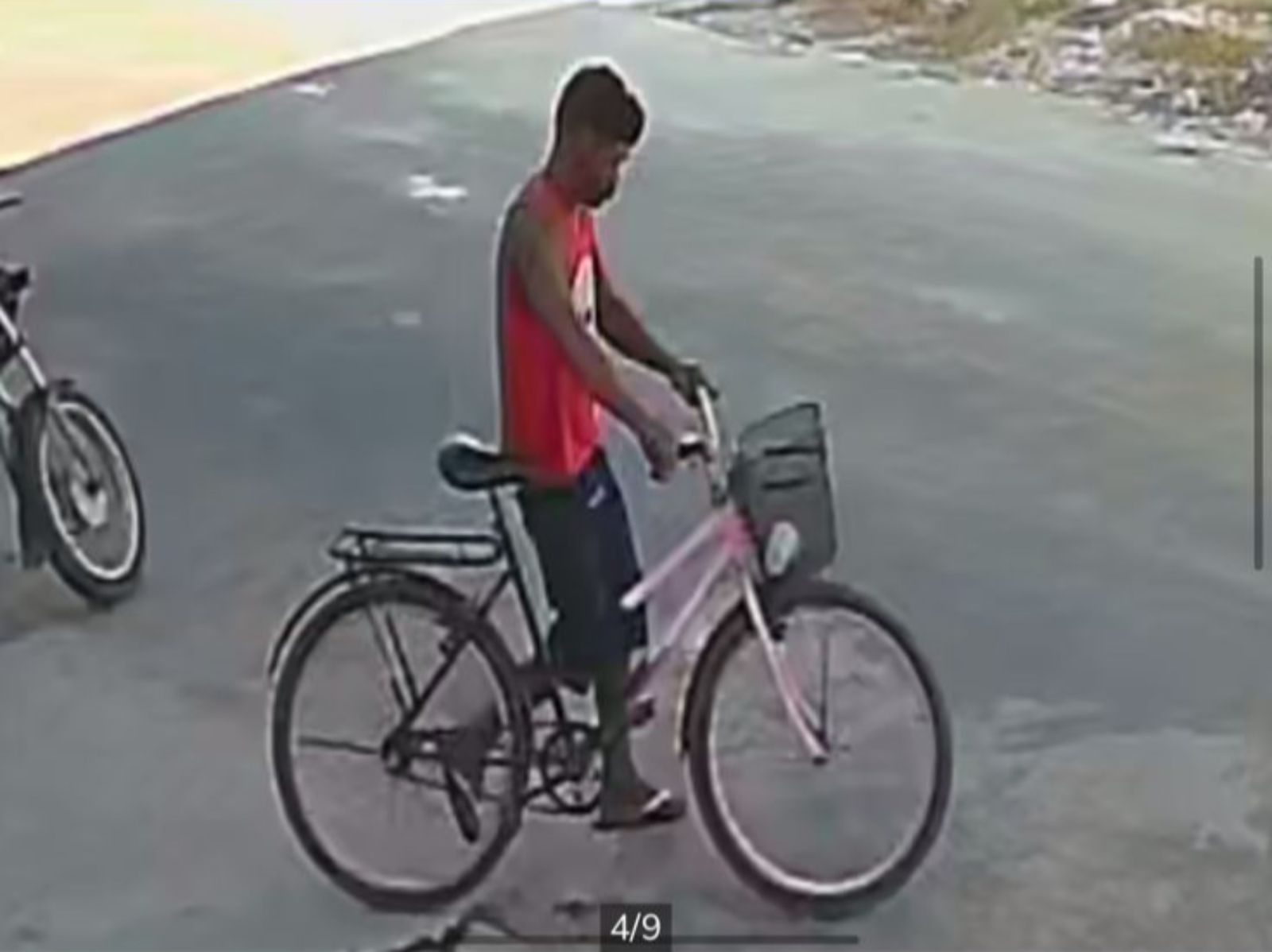 Nas imagens registradas pelos equipamentos de segurança, um homem, vestindo camisa regata na cor vermelha e bermuda jeans, aparece levando a bicicleta.