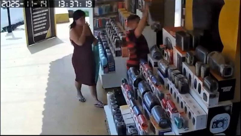 Nas imagens, é possível ver um homem e uma mulher colocando uma caixa de som dentro de uma sacola. Após esconderem o produto e deixarem o estabelecimento sem pagar, os dois fugiram do local.