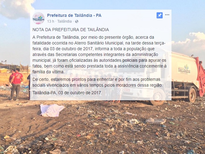 Menino de 10 anos foi atropelado na tarde desta terça-feira (03), no lixão de Tailândia por um caminhão basculante.