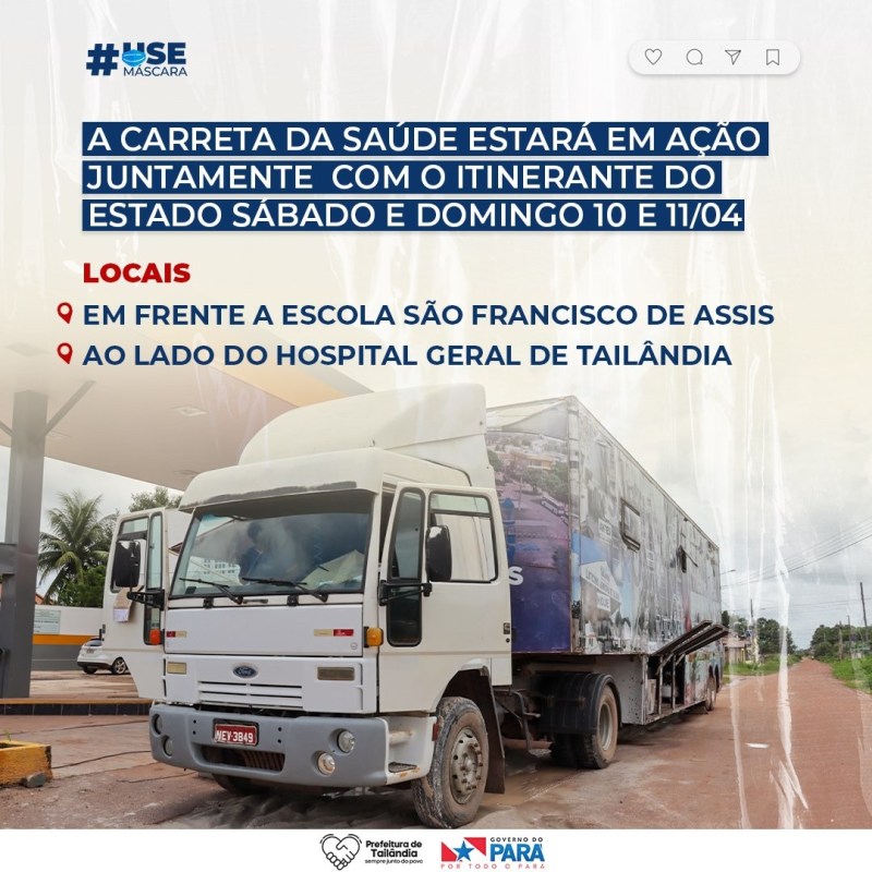 A carreta da saúde e estará em ação juntamente com o itinerante do estado realizarão atendimento neste fim de semana em Tailândia.