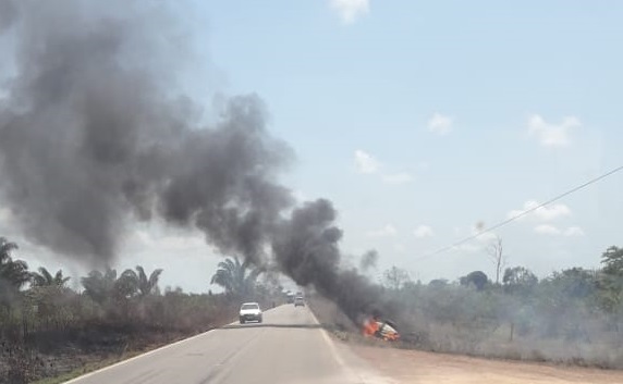 Carro de passeio pegou fogo após capotar na PA-150 entre Goianésia do Pará e Tailândia, na manhã desta sexta-feira (31). Não há informações sobre feridos e o que provocou o acidente.