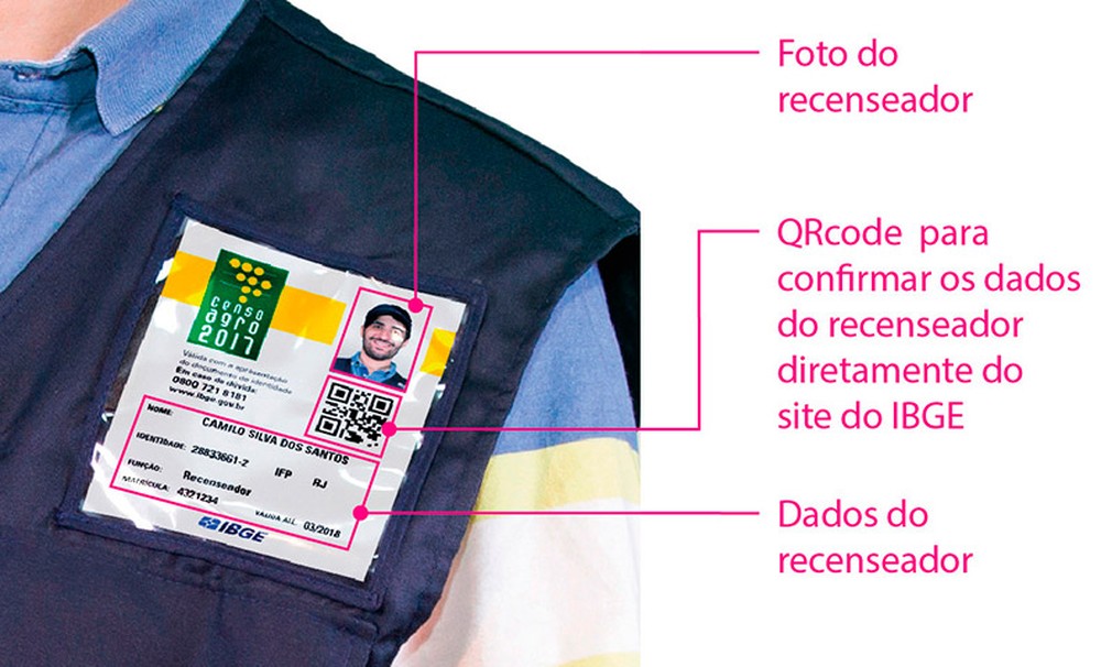 No crachá também poderão ser encontrados outros dados, como o nome completo do recenseador, sua matrícula, identidade e validade das informações ali constantes, além da foto do agente de coleta.