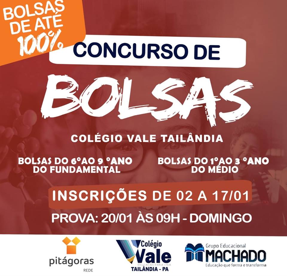 O colégio Vale da Rede Pitágoras, em Tailândia, está com concurso de bolsas integrais para os níveis fundamental e médio. O colégio faz parte do Grupo Machado, que é responsável pelo Polo Unopar em Tailândia.