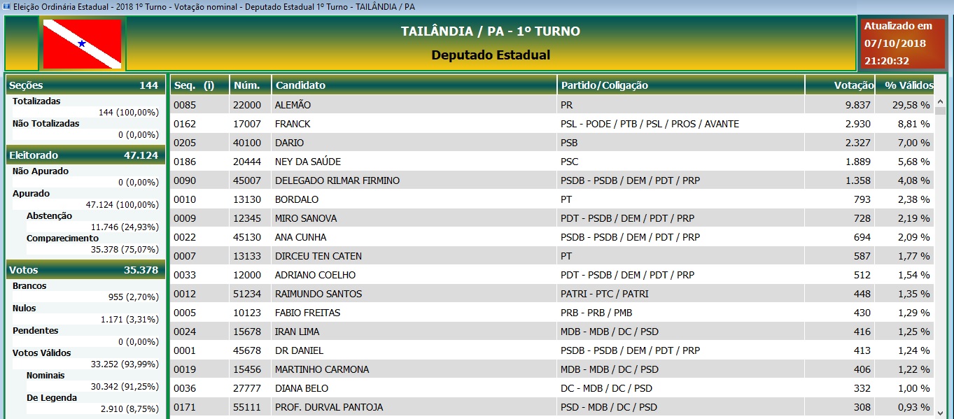 Agora tendo a votação apenas de Tailândia, os números de cada candidato direto do município ficou a seguinte.