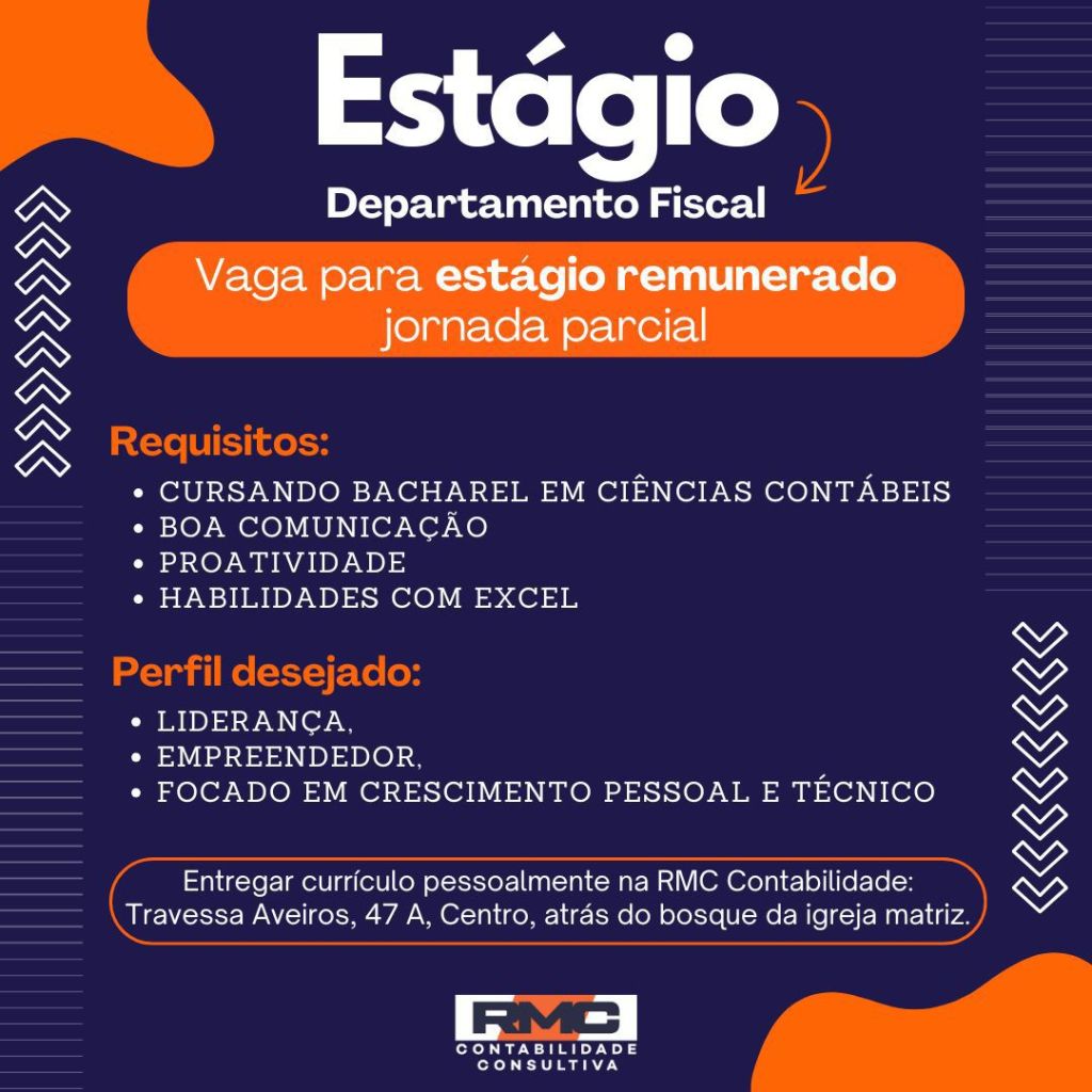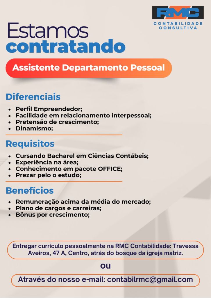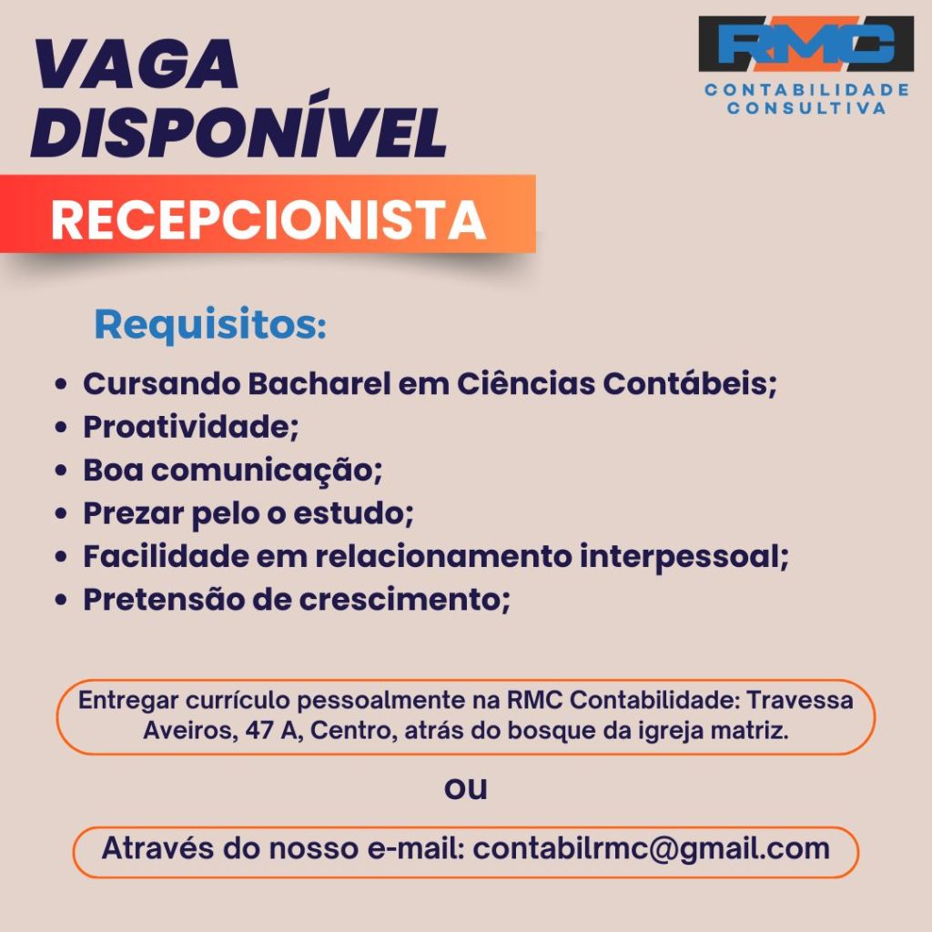 A RMC contabilidade com sede em Tailândia, nordeste do Pará, está contratando profissionais para os cargos de recepcionista, assistente departamento pessoal e estágio em departamento fiscal.