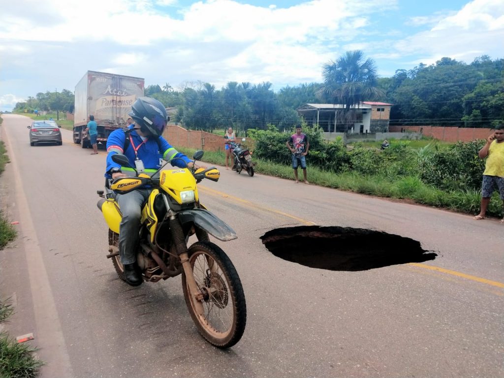 No local, onde a cratera se abriu passa um igarapé, o que pode ter contribuído para causar o estrago no asfalto. O fato ocorreu por volta das 13h desta sexta-feira (13). As fotos foram feitas minutos após a abertura, por condutores de veículos que passaram pela rodovia.