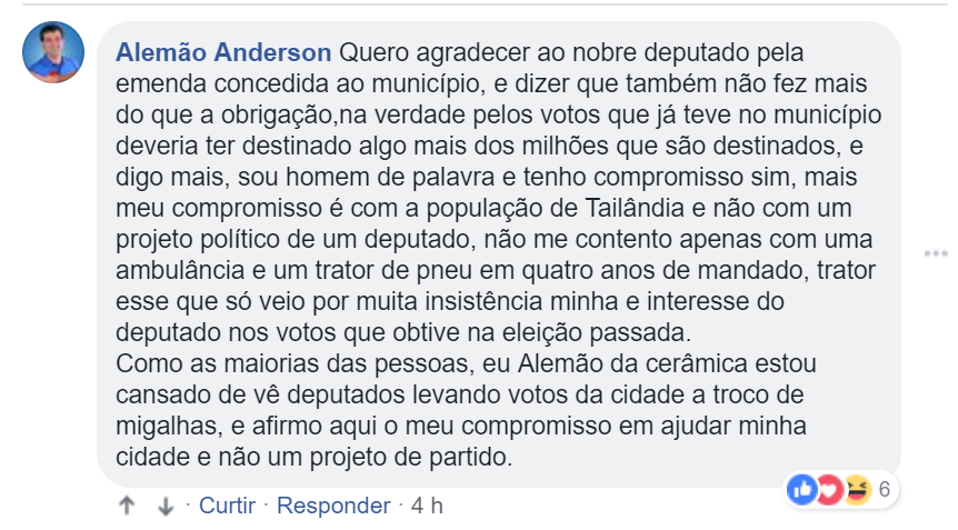 Miro Sanova só não deixou claro no vídeo, qual o tipo de compromisso teria firmado com Alemão. Embora, é bem provável que fosse apoio a sua candidatura a reeleição a Alepa. Apoio que não será possível ser dado por Alemão, já que, ele também anunciou que pretende concorrer a uma cadeira na Alepa, Assembleia Legislativa do Pará.