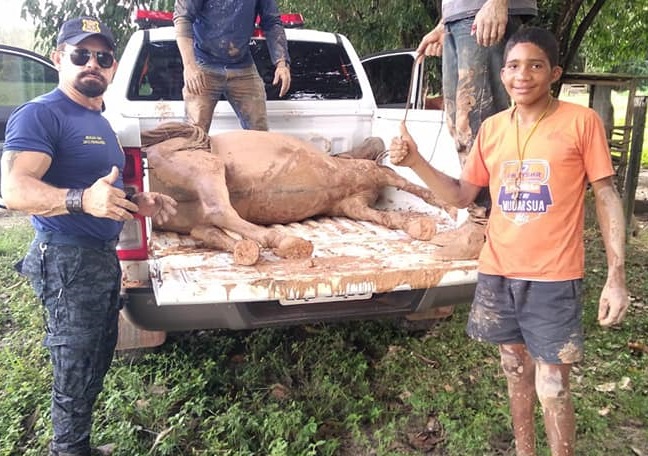 Com a ajuda dos Bombeiros, eles conseguiram retirar a égua do primeiro atoleiro, depois ela voltou a cair me um novo lamaçal, atrás da pista do Aeroporto, mas populares conseguiram ajudar novamente.