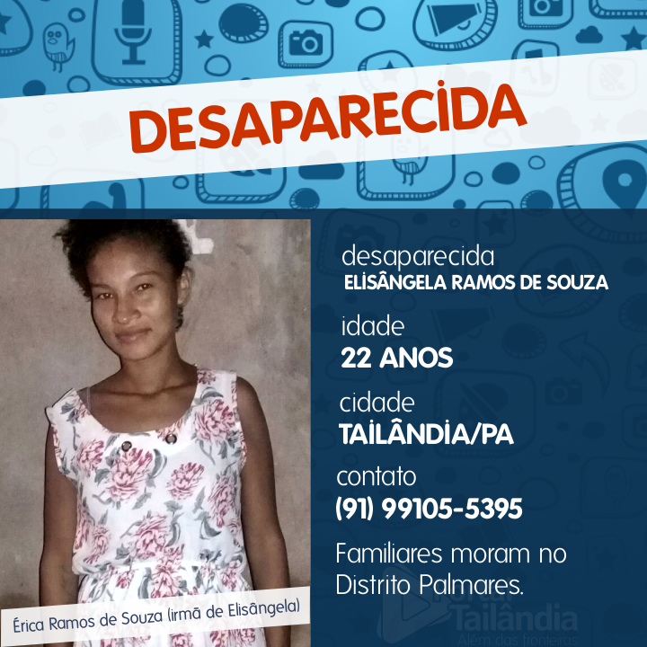 Elisângela sofre de problemas psicológicos e veio trazida de Distrito Palmares para o Hospital Geral de Tailândia por alguém desconhecido dos familiares, após sofrer agressões. Agora, uma semana depois ela estaria desaparecida na cidade de Tailândia, nordeste do Pará.