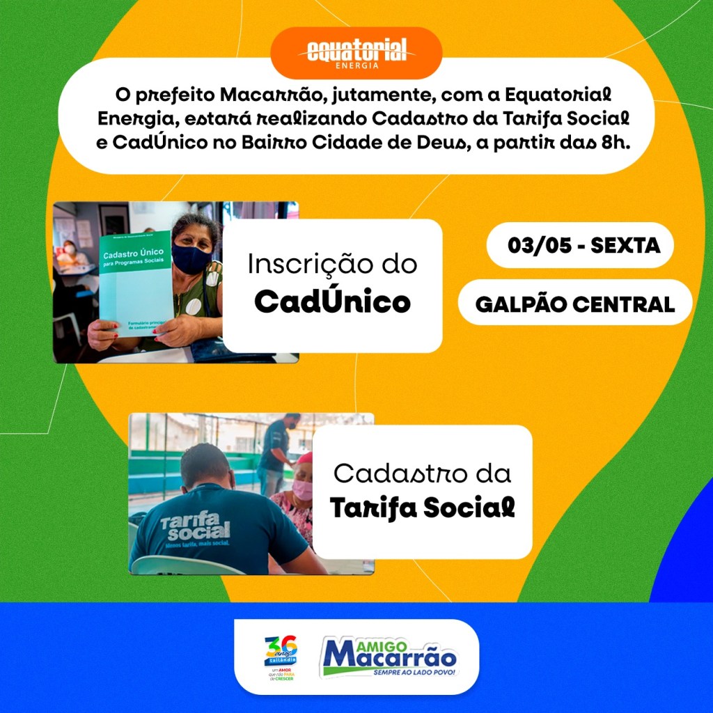 Através de uma parceria, o prefeito Paulo Jasper ‘Macarrão' e a Equatorial Energia/PA irão promover amanhã (03) em Tailândia, nordeste paraense, inscrições para o cadastro da Tarifa Social e do CadÚnico.