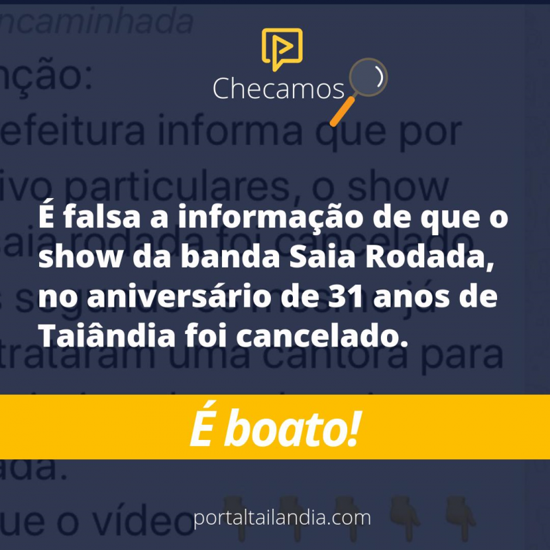 É falsa a informação que circula em grupos de rede sociais de Tailândia, sobre o cancelamento do show da banda Saia Rodada, nesta quinta-feira (09).