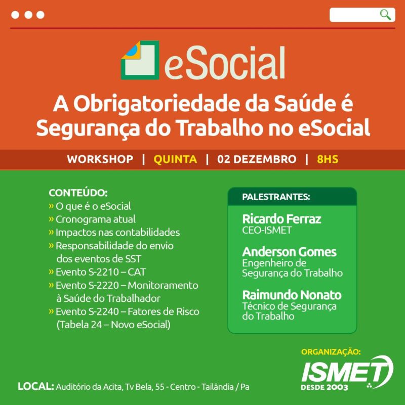 O Instituto de Saúde e Medicina do Trabalho de Tailândia (ISMET) realiza amanhã (quinta-feira, dia 02), às 08h, um workshop com o tema “A Obrigatoriedade da Saúde é Segurança do Trabalho no eSocial”, no município de Tailândia, nordeste do estado.
