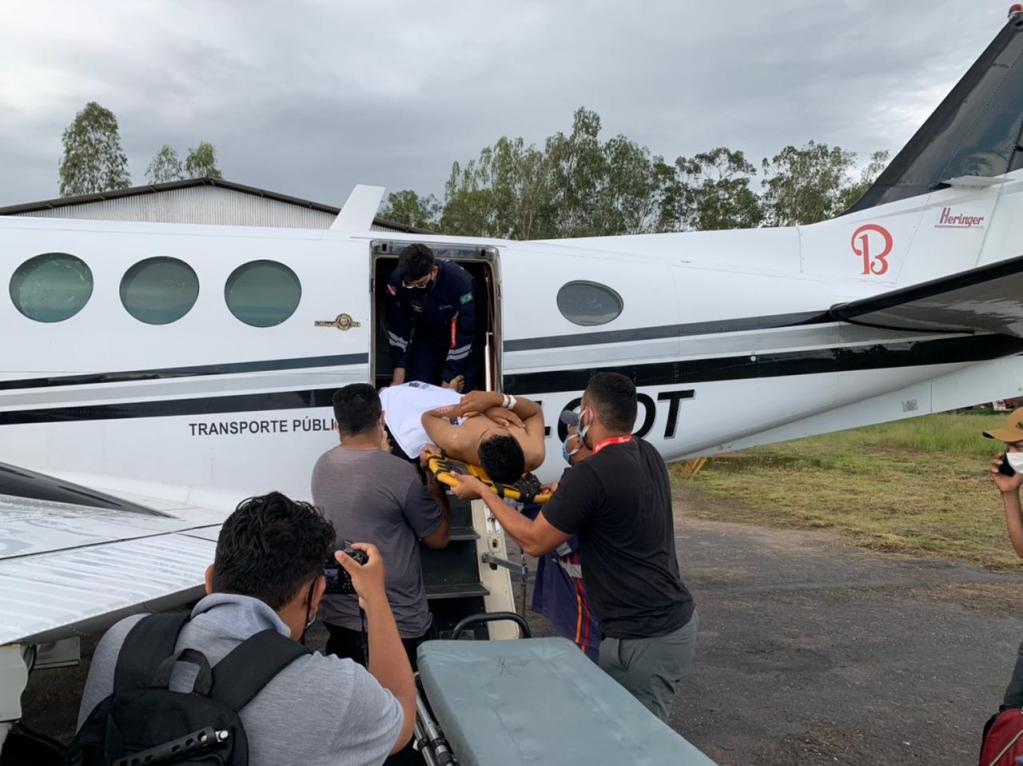 Com traumatismo craniano e fratura da patela esquerda, houve a necessidade da transferência. O quadro clínico é estável, e ele estava consciente e acordado no momento da transferência.