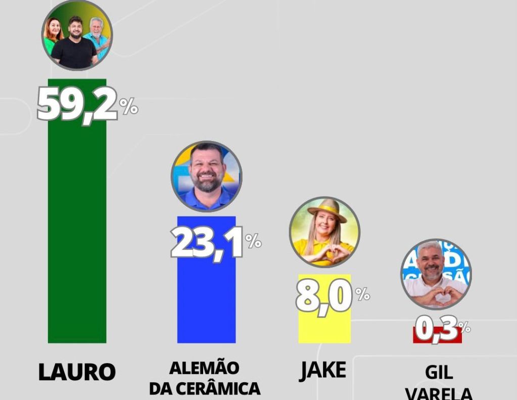 Na simulação estimulada, que reflete o cenário hipotético com apresentação dos candidatos, Lauro continua na liderança com 59,2% das intenções de voto, seguido por Alemão da Cerâmica com 23,1% e Jake com 8%.