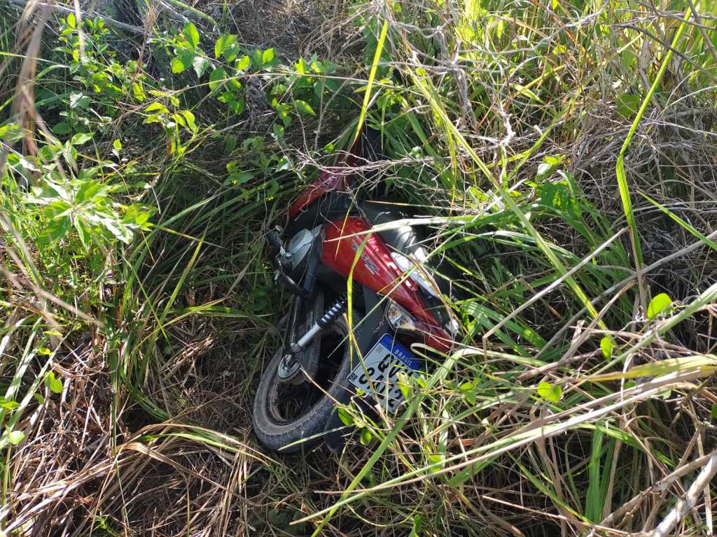 Os policiais encontraram a motocicleta na vicinal 11, depois de uma denúncia anônima. O veículo estava abandonado dentro de um matagal.