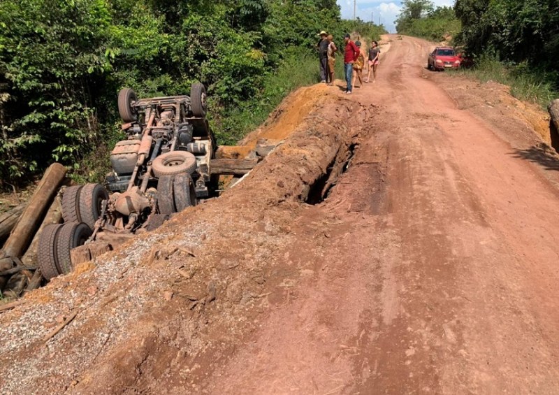 Um caminhão madeireiro, carregado com toras, tombou no início da tarde deste domingo (14) após tentar passar sobre a ponte do rio Pintauã, localizado na Vicinal 12, zona rural de Tailândia.