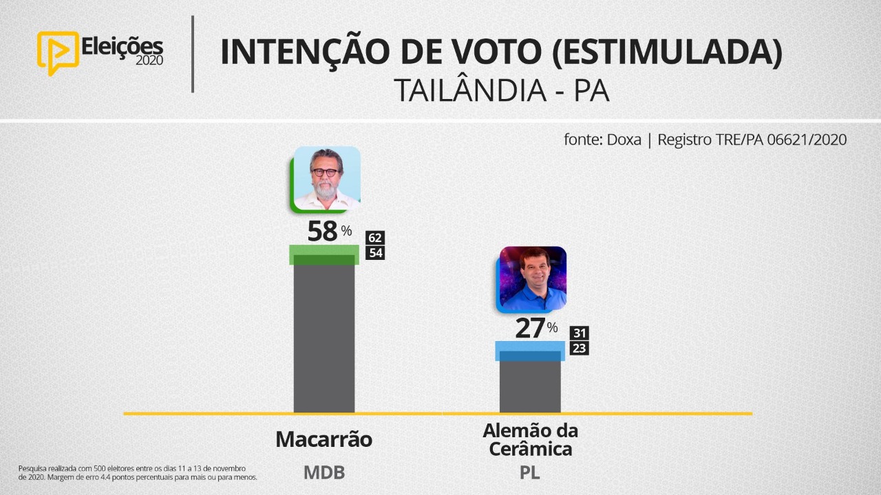 A última pesquisa Doxa, divulgada na tarde deste sábado (14), aponta vitória do candidato a reeleição “Macarrão”, do MDB, em Tailândia, com 58,3%; contra 27,2% de Alemão da Cerâmica, PL.