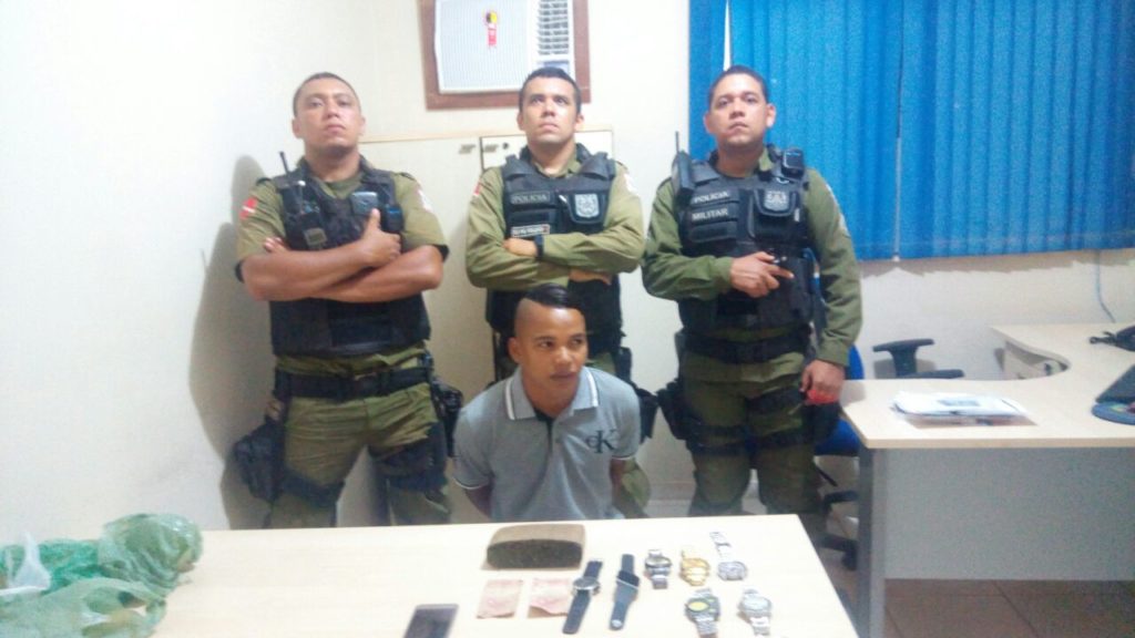 Com ele foi apreendido quase um quilo de maconha, além de relógios, um pequeno valor em dinheiro e um aparelho celular. Ele alega que o celular é de sua propriedade e que teria a nota fiscal do aparelho.