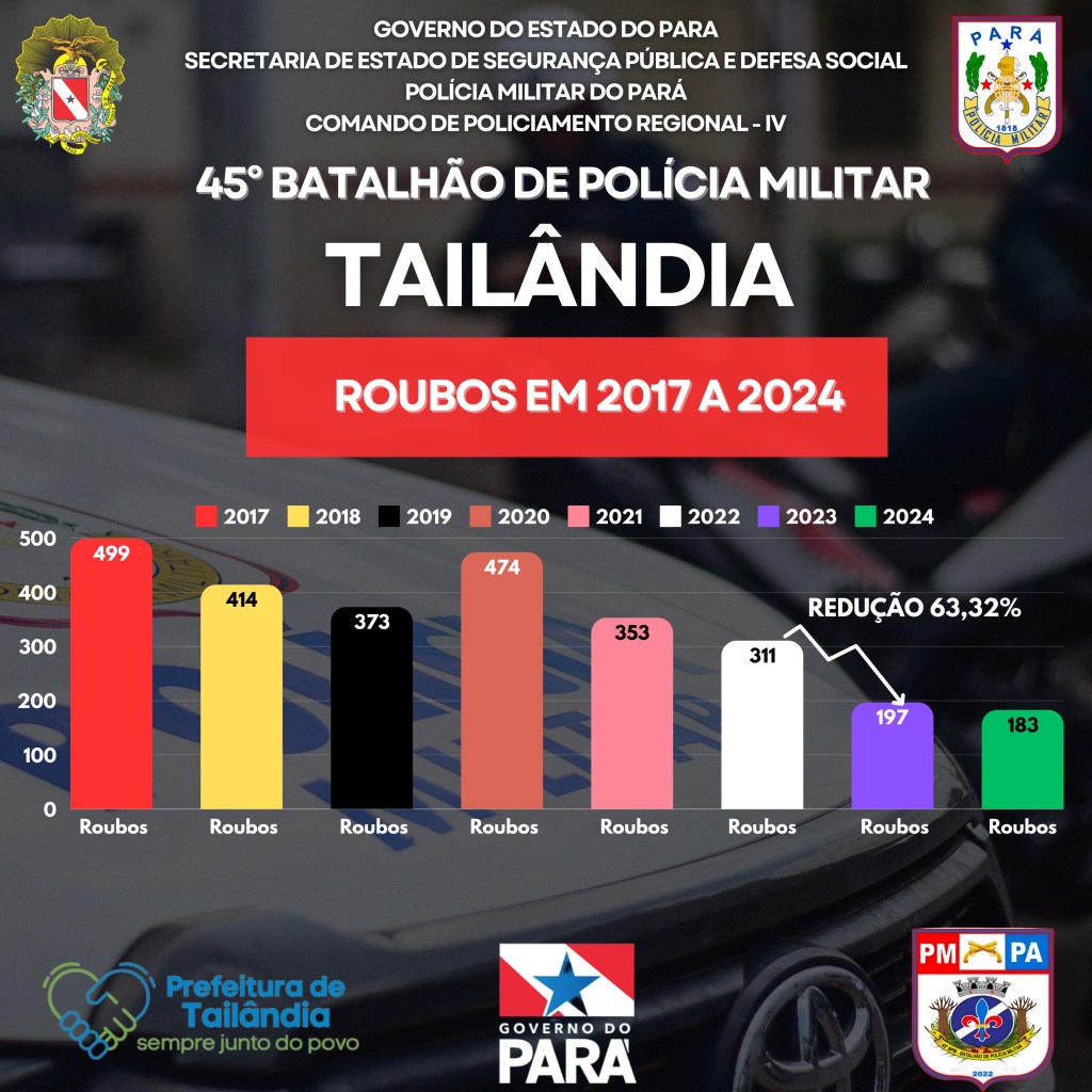 Para o 45° BPM (Batalhão de Polícia Militar), os dados positivos são resultados da forte parceria entre a Prefeitura de Tailândia, Governo do Estado e a Polícia Militar.