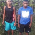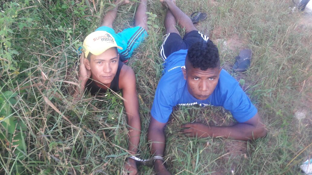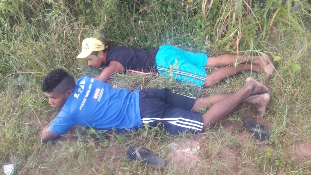 Diante do fato flagrante foi solicitado apoio de uma viatura para conduzir os marginais para delegacia. São eles, de camisa preta, Fabiano Brito Silva 19, residente na Vila Macarrão e de camisa azul, Andrei dos Santos Franco, 29, também residente na Vila Macarrão.