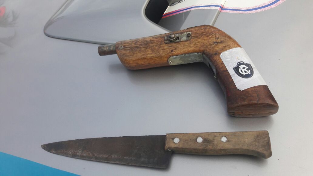 A Moto Guarnição da Polícia Militar de Tailândia em ronda matinal nesta sexta-feira, 09, pelos bairros Vila Macarrão e Bela Vista avisou dois elementos em atitude suspeita na Av. Aveiros, após abordagem e revista foi encontrado com os mesmos uma arma caseira e uma faça.