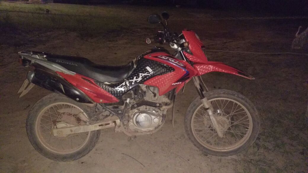 A guarnição de Moto Patrulhamento da PM, foi até a vicinal onde foi encontrada a motocicleta roubada, uma Bros, devolvida ao verdadeiro dono pela PM.