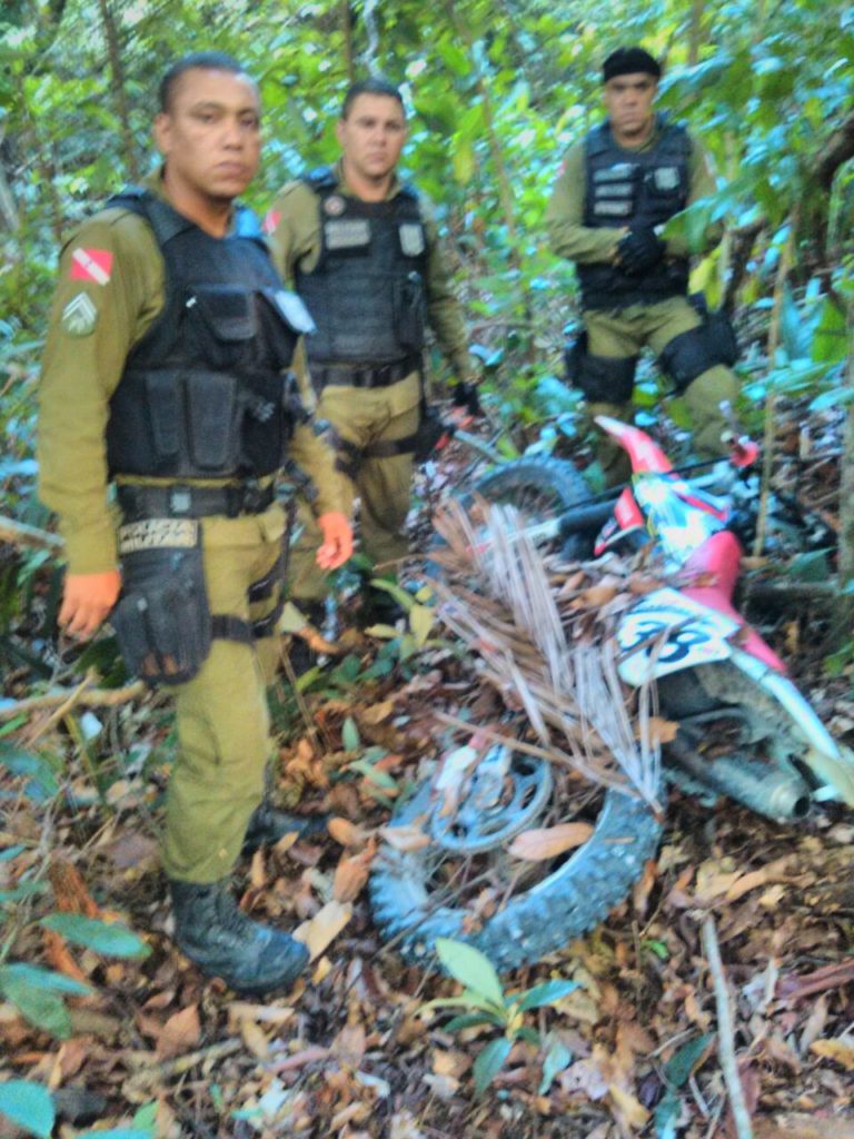 Após informações de populares que avistaram os suspeitos empurrando uma moto em direção a uma mata, a guarnição composta pelo cabo José, e soldados Carvalho e Frazão, se deslocou até o local informado e conseguiu recuperar a moto.