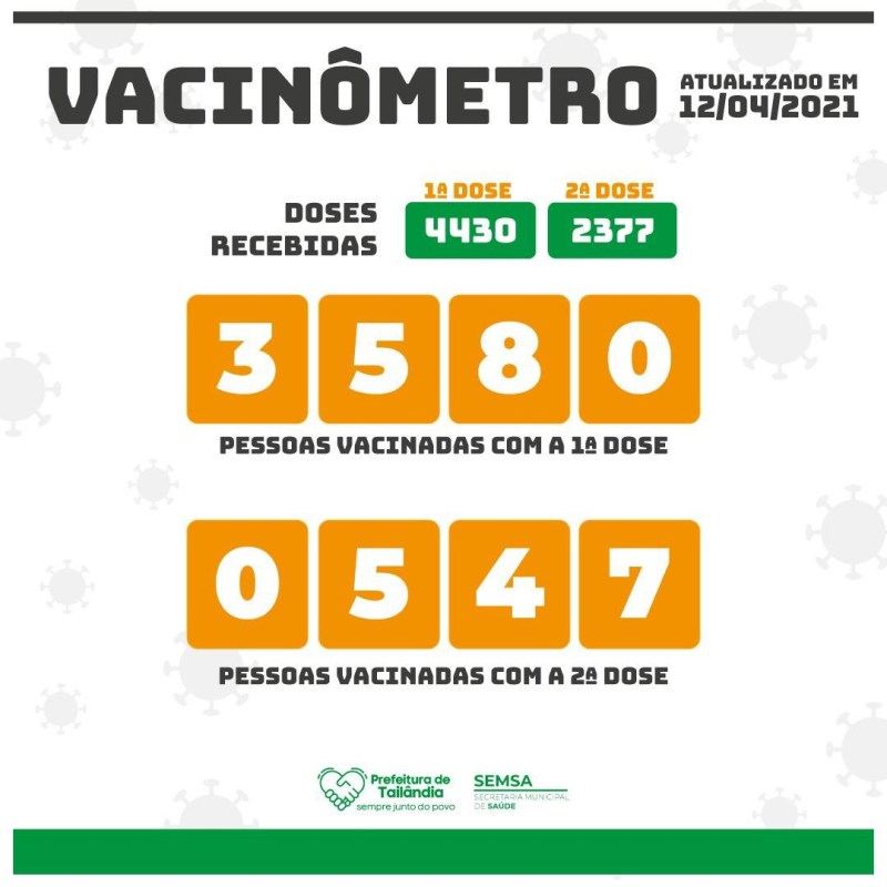 A Prefeitura de Tailândia criou um vacinômetro para que a população acompanhe a campanha de vacinação contra a covid-19. O município de Tailândia já recebeu até o momento, 4430 vacinas para a primeira dose de vacinação e 2377 para a segunda dose.