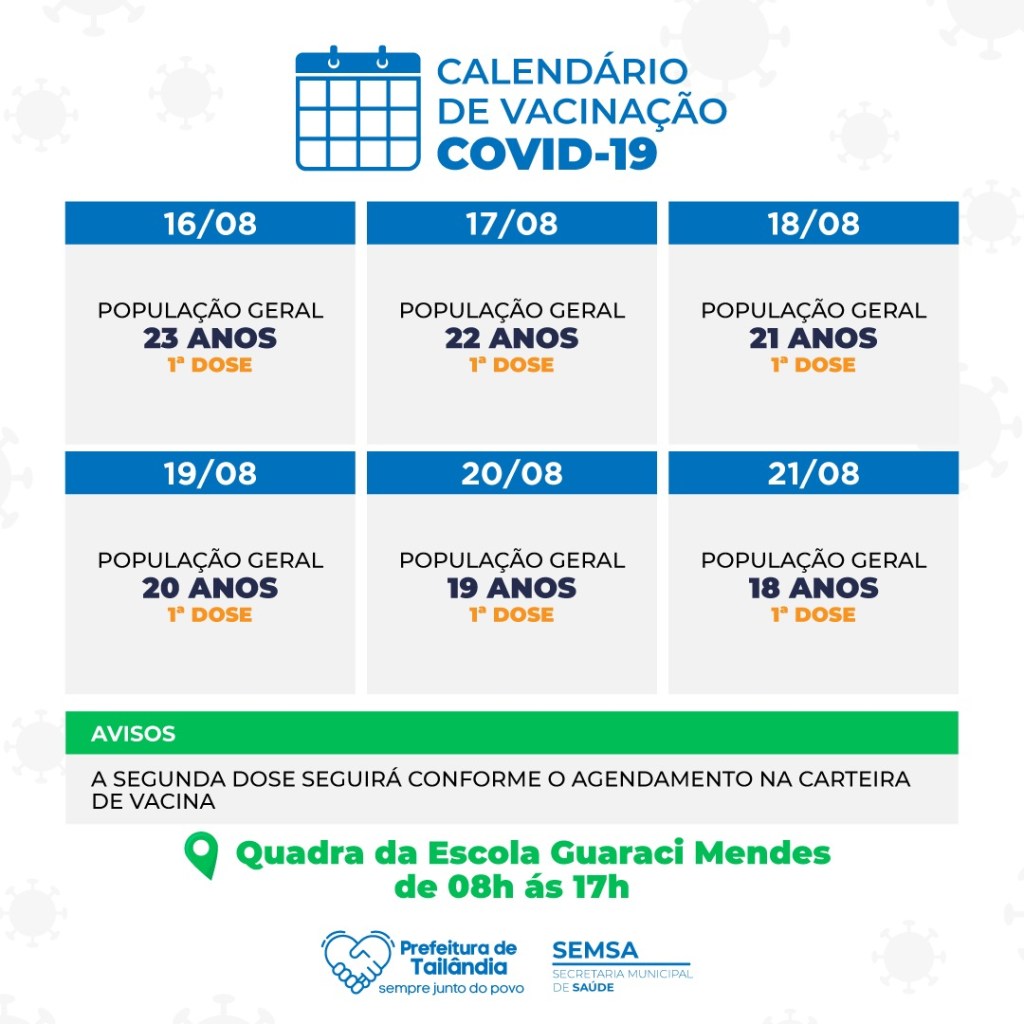 A Prefeitura de Tailândia retoma nesta segunda-feira (16) a vacinação contra a covid-19. Durante a semana serão imunizados com a 1ª dose jovens de 18 a 23 anos.