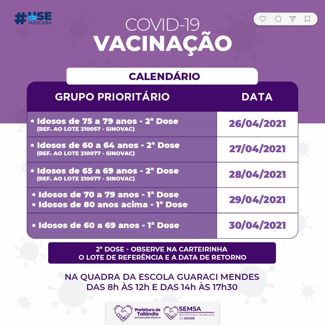 A prefeitura de Tailândia divulgou o novo calendário de vacinação contra a covid-19 em Tailândia, nordeste paraense. O objetivo é ampliar a aplicação das vacinas de Imunização da Covid-19 no município.