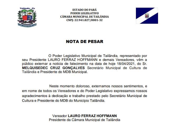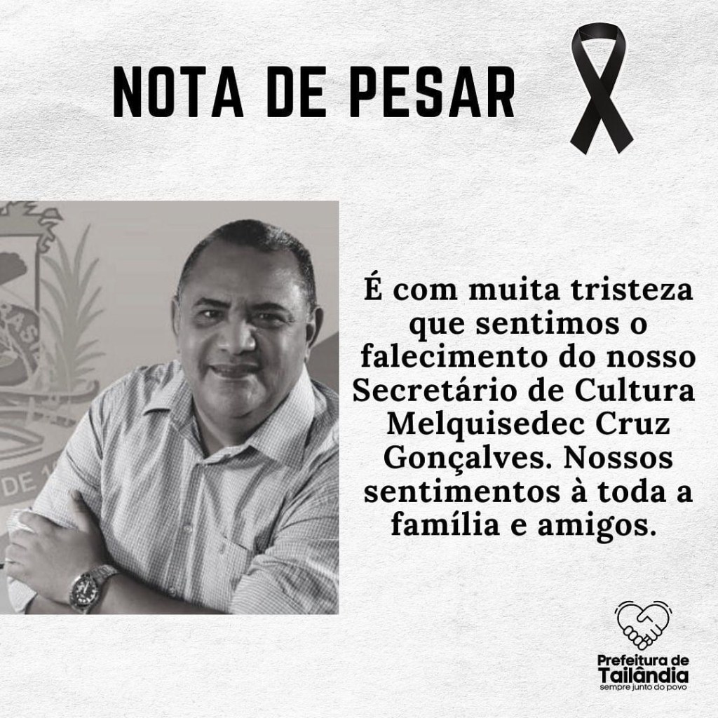 A prefeitura de Tailândia e Câmara Municipal de Vereadores lamentaram profundamente a morte, neste domingo (18) do Secretário Municipal de Cultura, Melquisedec Cruz Gonçalves, 52 anos de idade.