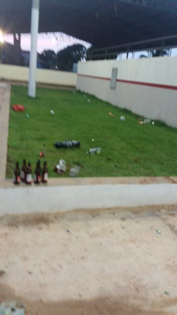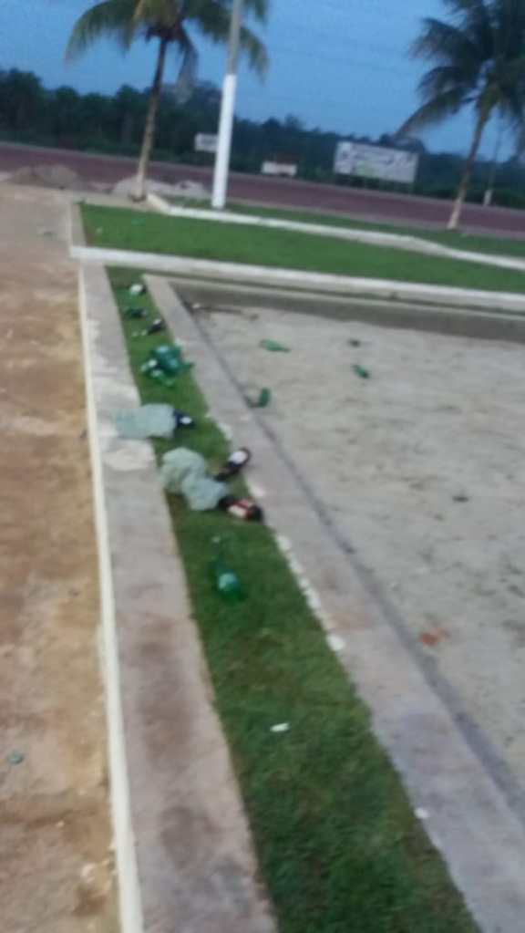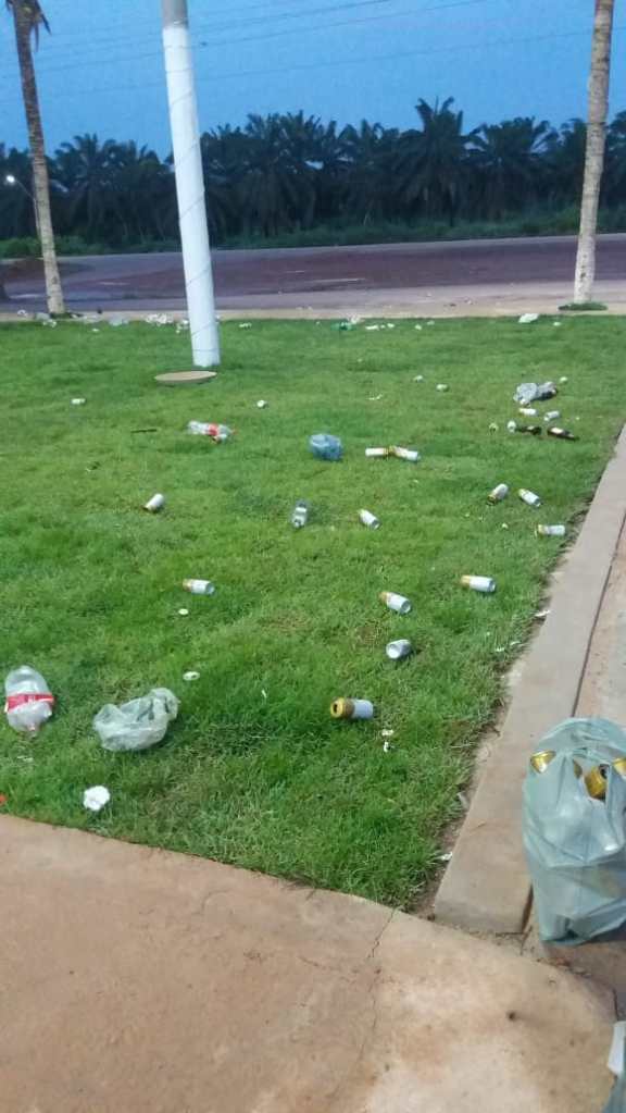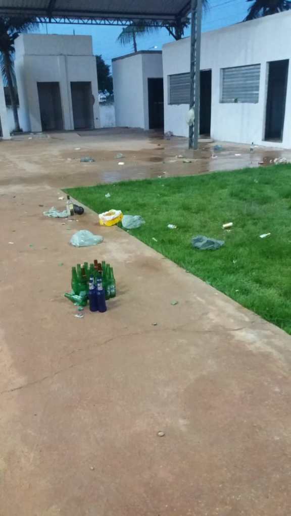 Imagens feitas por moradores mostram o resultado de uma noite de bebedeira na Praça do distrito Palmares, que ainda será oficialmente inaugurada pela Prefeitura de Tailândia. Nas imagens, há lixo e garrafas de bebidas no ambiente da praça e da quadra de esportes.