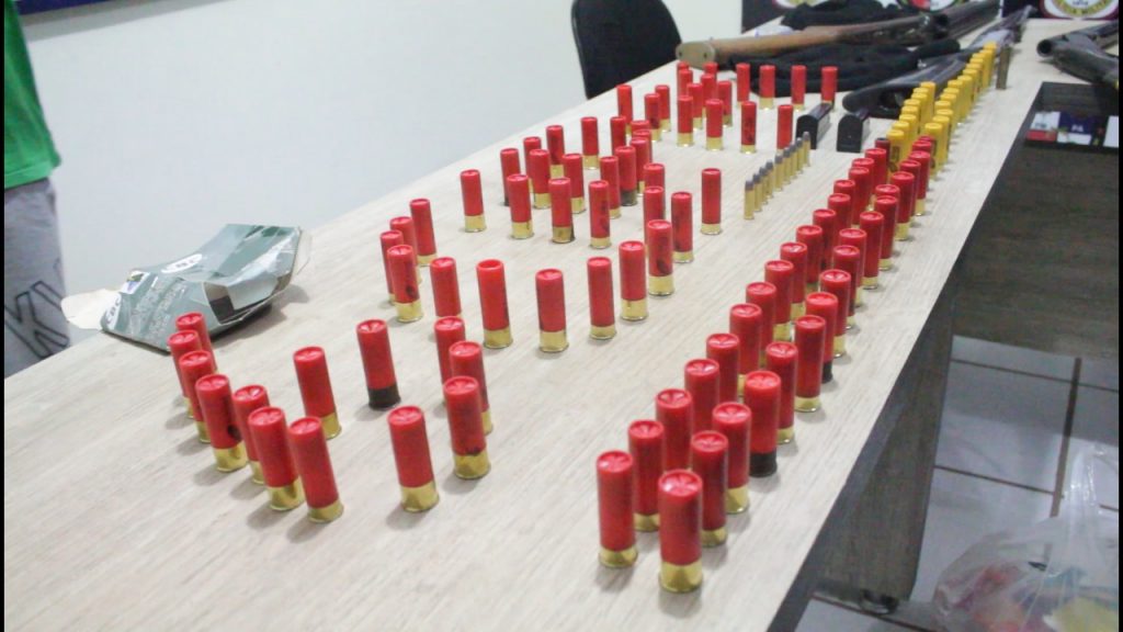 Uma grande quantidade de material que estaria em poder deles foi apreendida. 6 espingardas, 2 coletes a prova de bala, 2 balaclavas, roupas camufladas, lonas e 140 munições de diversos calibres.
