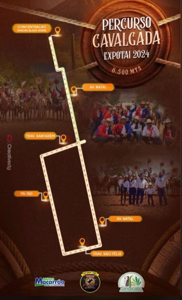 Logo após o concurso, acontecerá a Cavalgada, que está programada para o dia 01 de setembro. O percurso será de 8km e a concentração será no Rancho Black Horse. Veja: