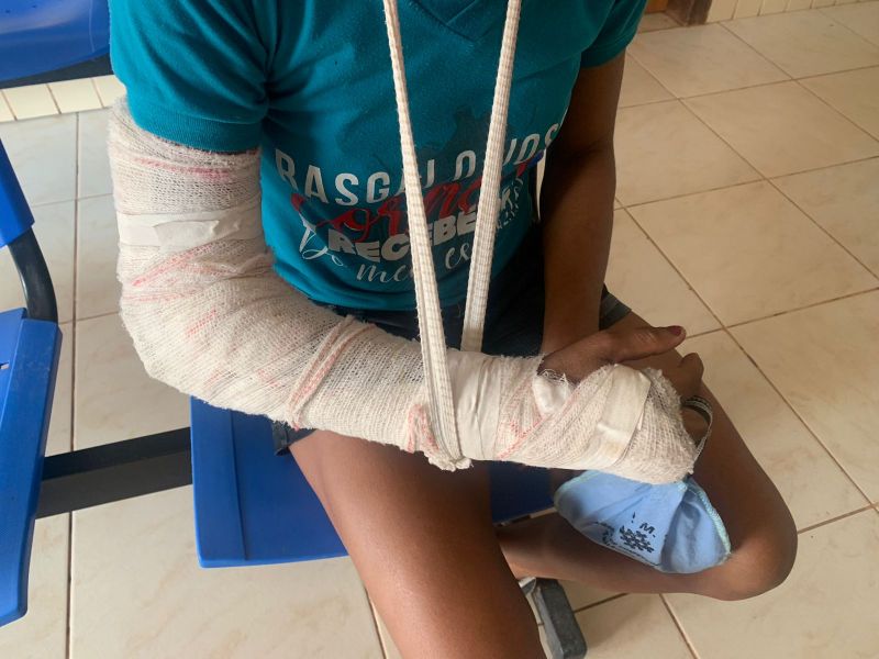 Depois de ser empurrada, ela caiu e quebrou o braço. Domingas precisou de cirurgia e passou cinco dias internada no Hospital Geral da Tailândia (HGT).
