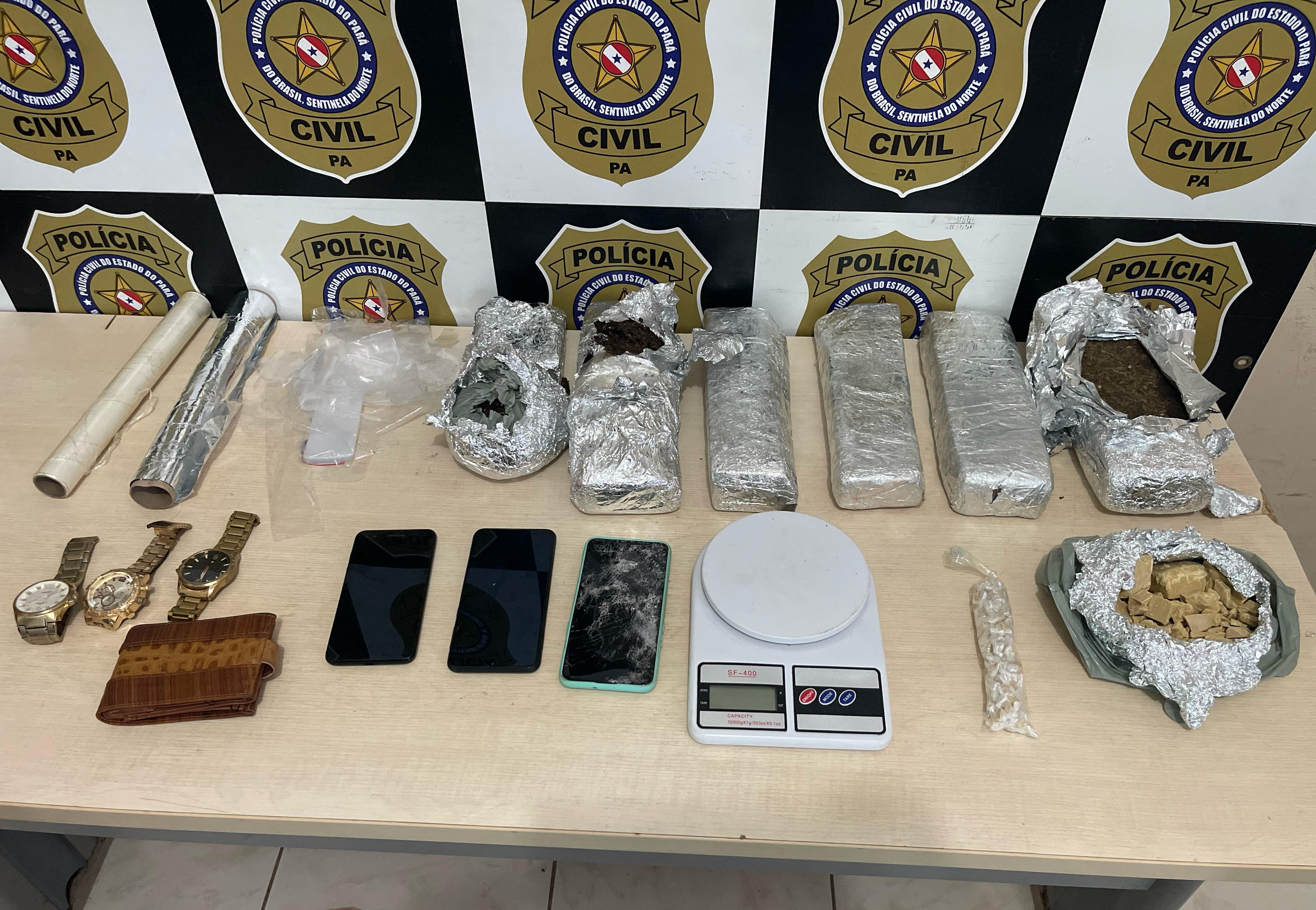 Durante buscas pela casa, foram encontrados mais de quatro quilos de maconha, oxi, celulares e relógios. Os criminosos relataram aos PM's que estariam traficando os entorpecentes.